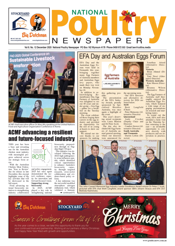 January 2026 headlines: Hazeldenes honoured with 2025 Safety Smart Broiler Chicken Farming Award EFA 2026 update and milestones Standing guard against a clear and present risk Foodbank Queensland and Sunny Queen Australia support regional communities Don’t chicken out for welfare’s sake Japan confirms AI outbreak in Kyoto Clean sheds fast with Aussie Muck Off series…