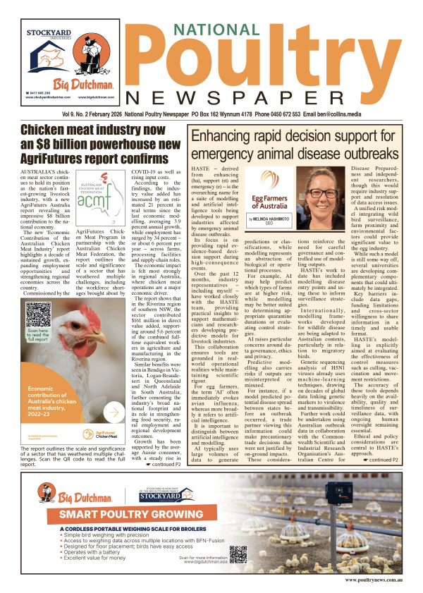 February 2026 headlines: Chicken meat industry now an $8 billion powerhouse new AgriFutures report confirms Enhancing rapid decision support for emergency animal disease outbreaks New national coordinator strengthens feral cat and fox management across Australia Why water delivery and bird distribution are defining next gains in poultry production One way to improve animal welfare Gorman-Rupp…