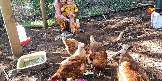 Though momentarily put off when an inquisitive Isa Brown quickly moved in on the bread crust she held in her little fingers, she soon settled as the friendly inquisitive chickens circled while seeking scraps.